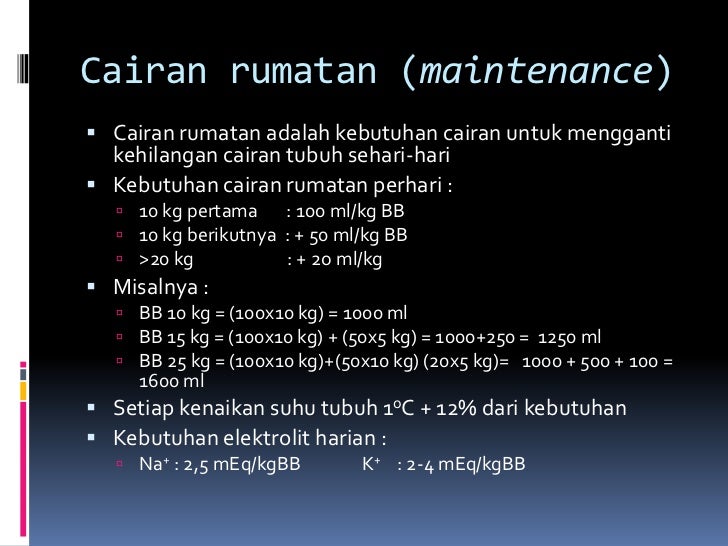 Cacing infus anak cairan infus lebih tebal seperti darah, biasanya faktor tetes adalah 15 (drops / ml). Cara menghitung tetesan infus pada anak-anak. Menghitung tetesan infus pada anak-anak juga dapat dilakukan secara manual jika tidak menggunakan mesin otomatis. Dengan demikian, pasien ini membutuhkan infus untuk menghabiskan 100 hingga 500 ml cairan dalam 100 menit menggunakan infus set terumo. Formula menandai usia di Excel. Cairan pada anak yang mengalami nyeri DBD pada putra rumah sakit Muhammadiyah Gresik, yang sebelumnya pasien.